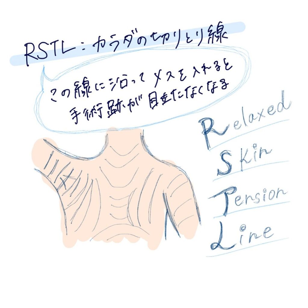 当院では、傷跡が最も目立ちにくくなる方向であるRSTL(リラックススキンテンションライン)を意識したS字切開を行います。