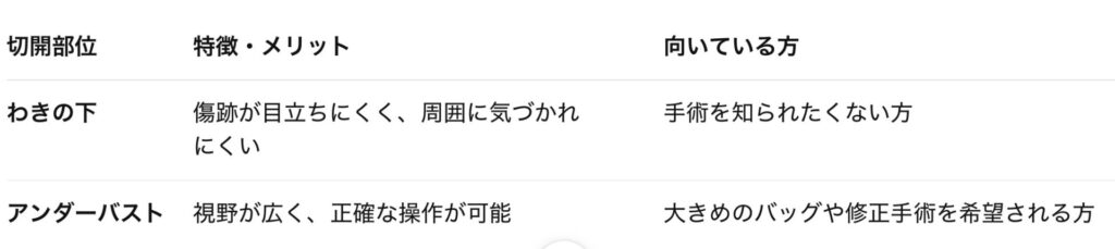挿入のための切開部位は主に以下の2種類です。