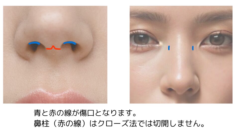 オープン法とクローズ法で違いがありますが、左右両方の鼻の穴の中を3~4mmと鼻柱、