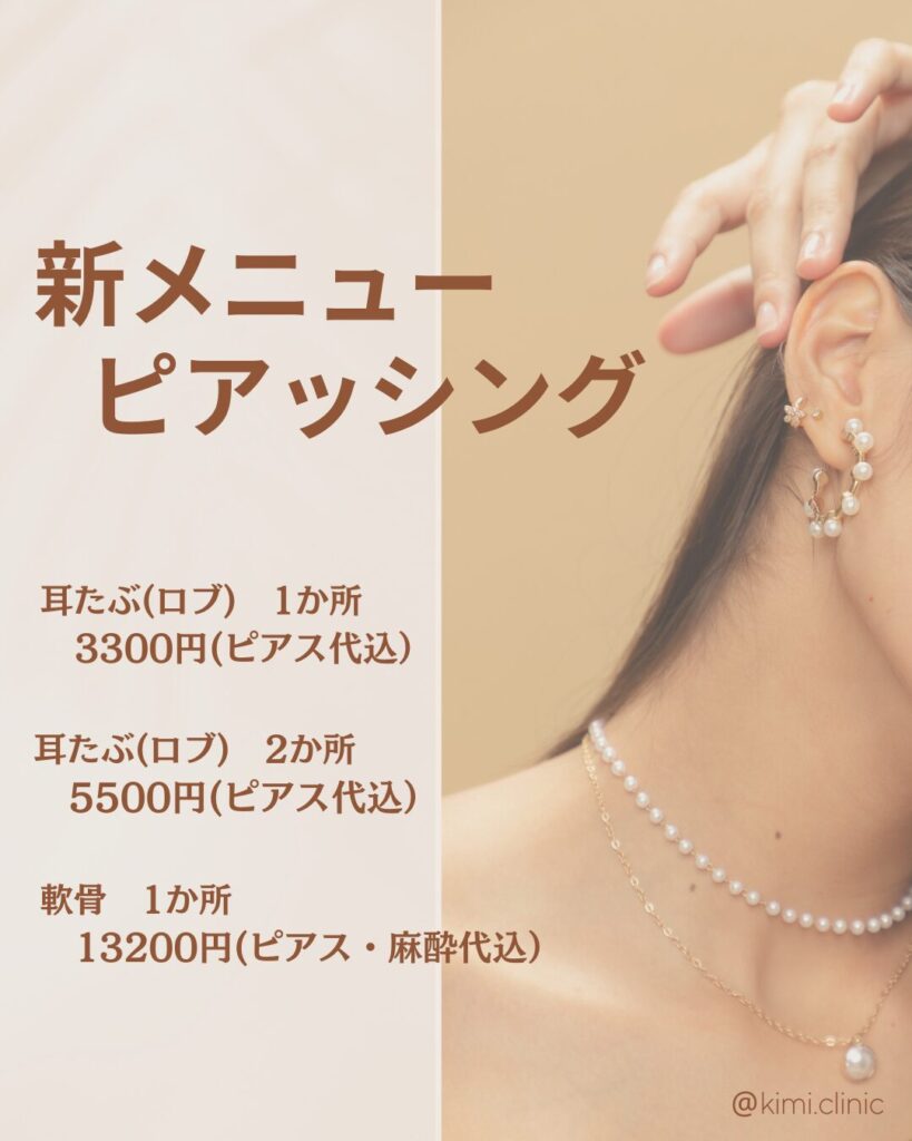 お知らせ ピアッシング 始めました 2024.09.1 キミクリニックでピアッシング(ピアスの穴あけ)始めました! ピアスをきれいに空けたい、空けたいけど怖くてできない等ございましたら 気軽にお問合せくださいませ☺ 部位、料金については下記画像をご参照くださいませ。 現在LINE新規ご登録クーポン配布中!! この機会にご登録のほどよろしくお願いいたします。 また施術についてのご相談やご予約もLINEからが便利です☺ 公式LINEはこちらから 当院Instagramでは最新お得な情報を配信中。 また志藤院長のInstagramには手術の解説や症例写真を投稿しております。 一覧に戻る
