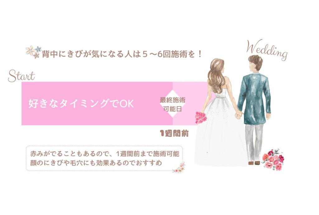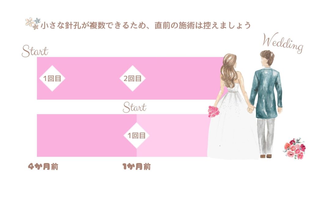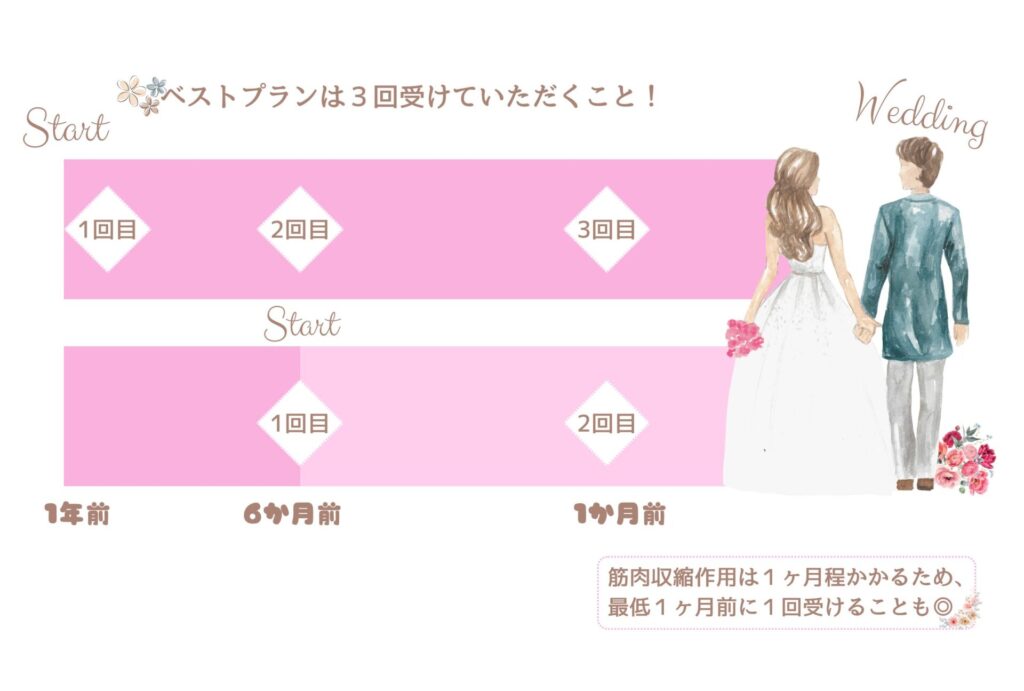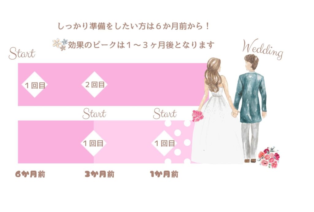 今から結婚式を迎える方、まだ先だけど備えて準備をしたい方向けに、施術内容や開始時期も含めてご紹介いたしました💘