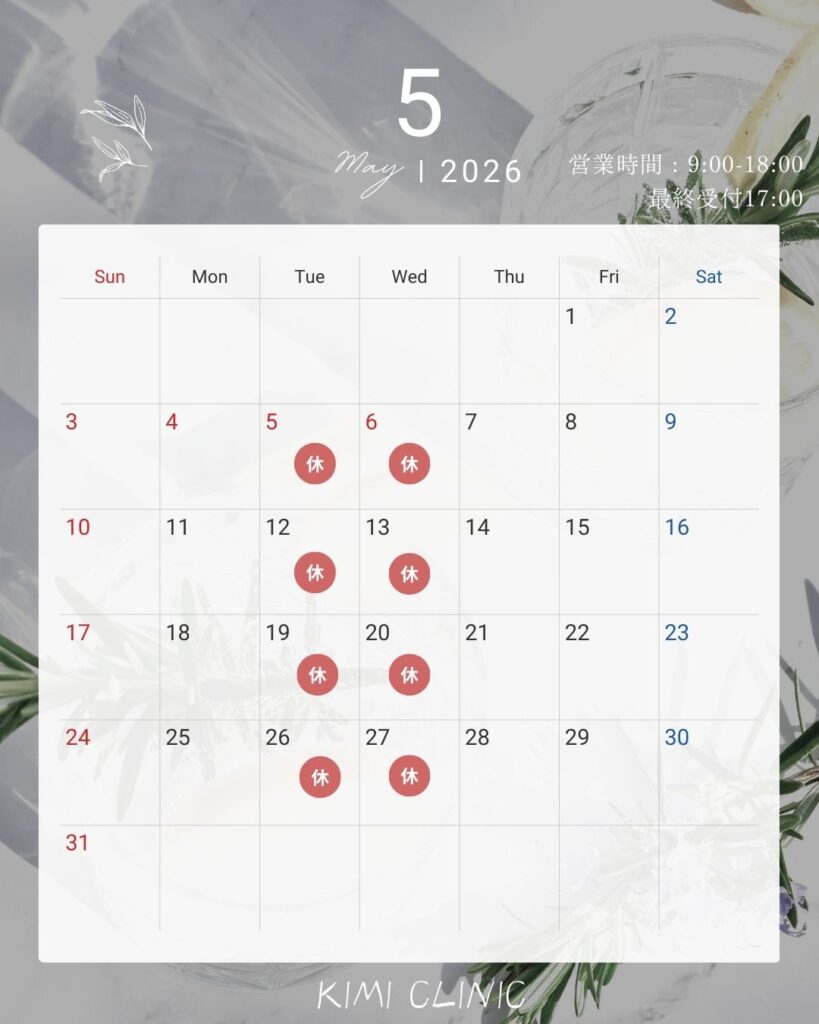 5月は通常通り火曜日、水曜日がお休みとなっております🤗