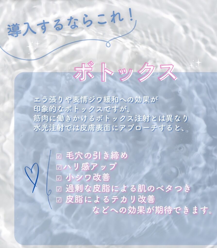 エラの張りや表情じわ緩和への効果が一般的ですが、筋肉に働きかけるボトックス注射とは異なり、水光注射では皮膚表面にアプローチします。