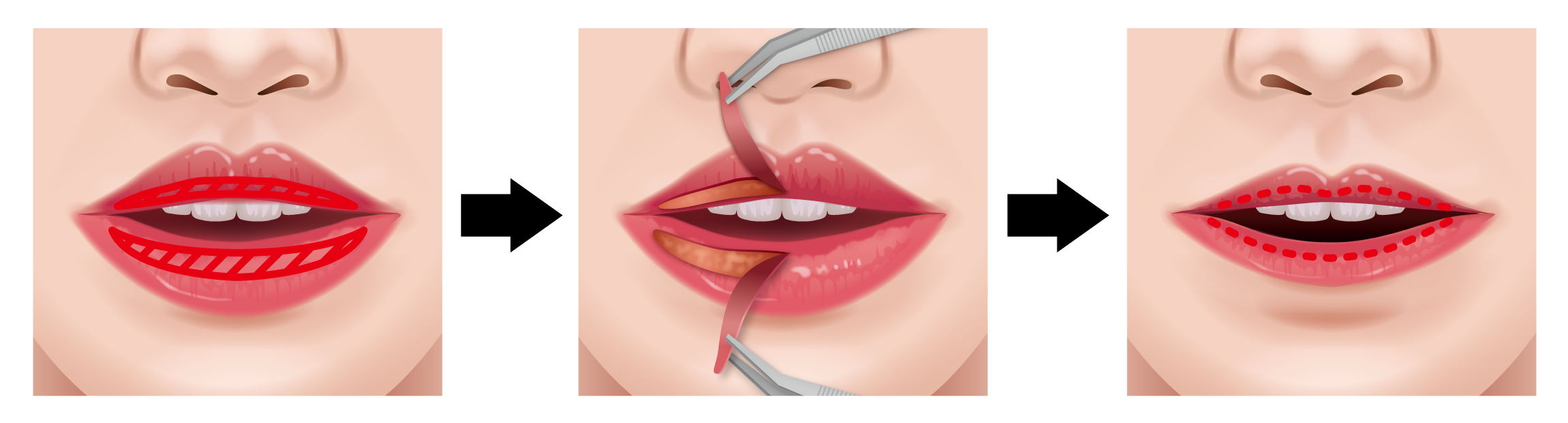 口唇縮小は 上下口唇の皮膚と粘膜の境界を切除することで唇の厚みを減らし、唇の存在感を改善させることができます。